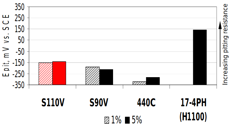 CPM S110V weist im Vergleich zu anderen martensitischen rostfreien Werkzeugstählen mit hoher Härte wie 440C und CPM S90V eine verbesserte Korrosionsbeständigkeit auf. Die Ergebnisse von Korrosionsprüfungen in repräsentativen Medien werden durch die folgenden Laborprüfdaten veranschaulicht.